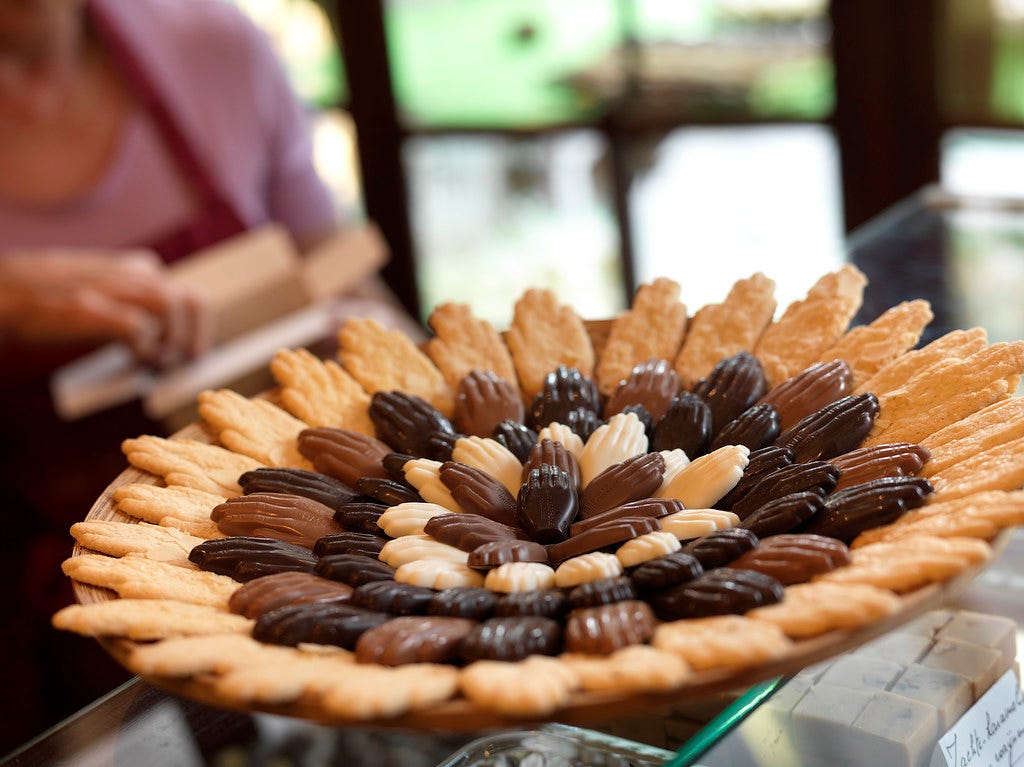 The most famous Belgian chocolate variety is the Belgian praline. In 1912, Jean Neuhaus Jr. (ironically a Swiss migrant) from Neuhaus Chocolates invented the praline. Before that chocolate with filling had shells that were thin because they were made by dipping the filling in chocolate. This limited the filling inside — they cannot be too liquid or too delicate or the thin shells would not be able to hold them. Neuhaus’s creation was a chocolate couverture shell that he then filled with almond paste. Today, they come in all shapes and sizes — see Guylian’s iconic sea shells.
